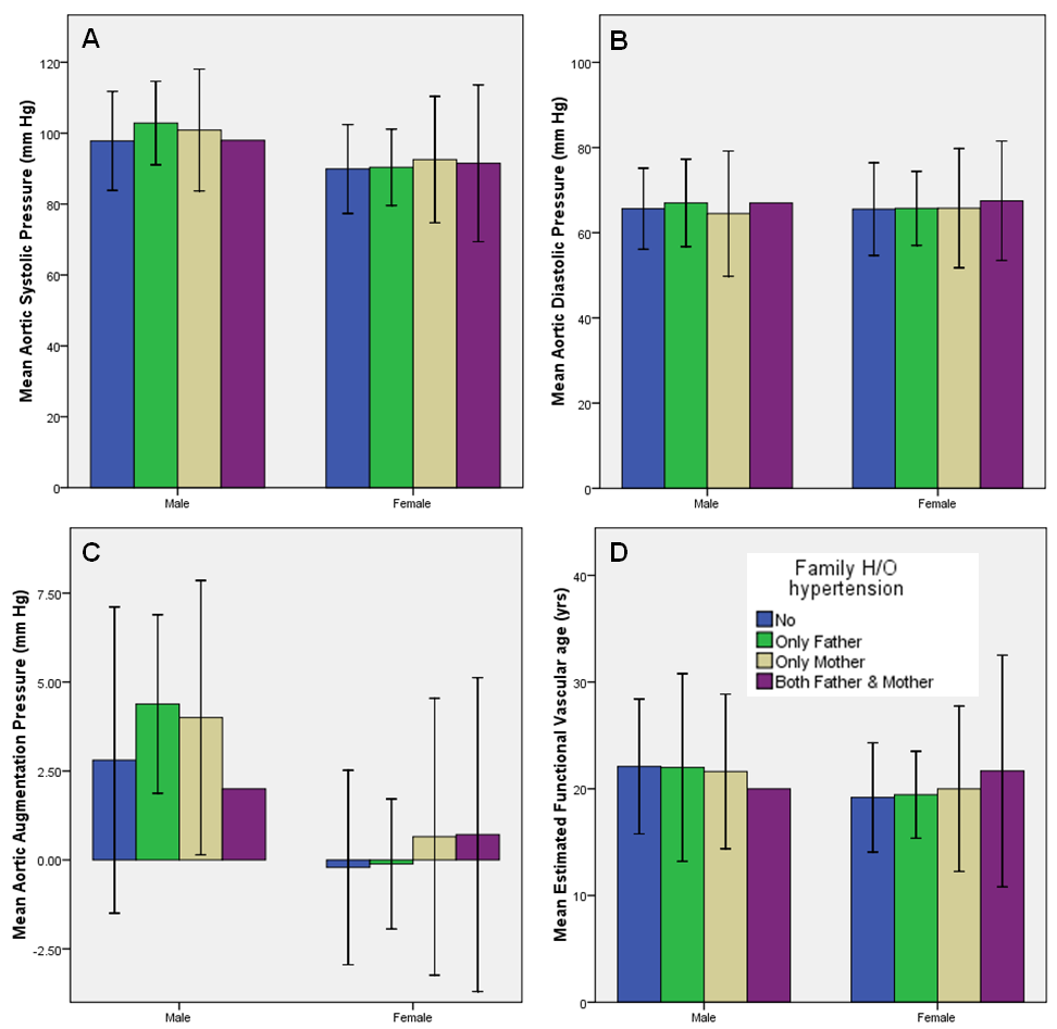 One European study showed that the children of hypertensive parents had higher peripheral BP and pulse pressure on conventional BP measurement as well as on 24-hour ambulatory BP monitoring; also had raised central pulse pressure, peripheral augmentation index and central augmentation index compared with offspring of normotensive parents. They concluded that large-artery properties are altered in offspring of hypertensive parents compared with offspring of normotensive parents. However, the difference in peripheral augmentation and central augmentation indices were negligible after adjustment for age suggesting that the alterations in arterial function in subjects with a family history of hypertension is determined mainly by age-related hemodynamic changes [5].