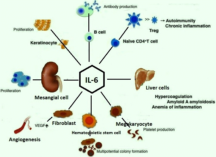 IL-6 stimulates terminal differentiation of B-lymphocytes and enhances immunoglobulin secretion by the B cells [8]. It is a cofactor for hemopoietic colony growth and thymocytes [9]. It stimulates hepatocytes to produce acute phase proteins like the C-reactive protein (CRP) [10]. It also acts as a growth factor for B cells [11].