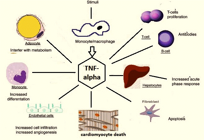 TNF-α is a multifunctional and a pleiotropic stimulator of cellular responses [12]. It is cytolytic to certain tumor cells [13]. It is an inducer of cytokines and cell adhesion molecules and is a regulator of proliferation/differentiation in lymphocytes and hemopoietic progenitors [14]. It is also known to cause insulin resistance [15].