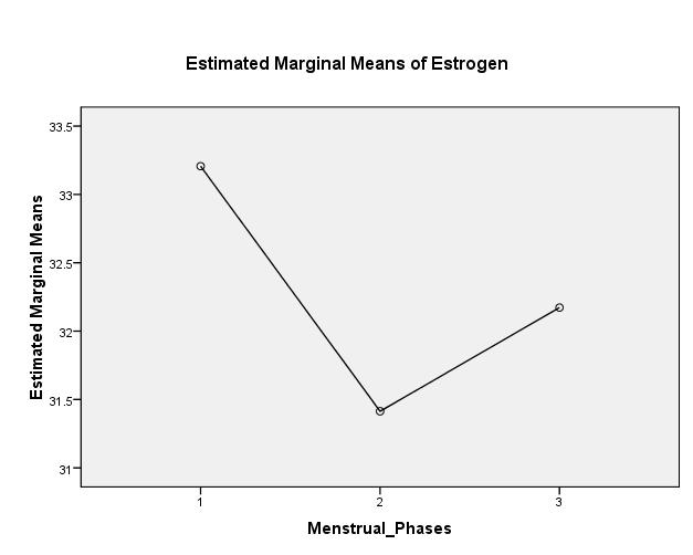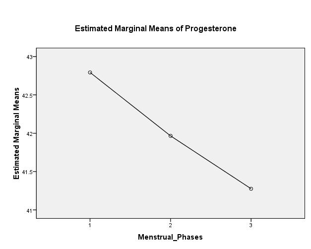 Estrogen [F(1.351) = 2.201, p = 0.139] and progesterone [F(2) = 1.48, p = 0.236] did not show any significant variation during the 3 phases (Table 5; Figure 4 and 5 respectively).