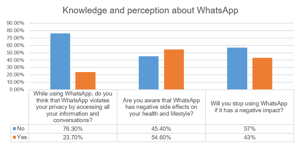 Only 23.7% participants reported that they thought about the violation of privacy for users by WhatsApp and 54.60% stated that they were aware of the impacts of WhatsApp on health and life style of the users. Though, 56% participants confirmed that they are not willing to give up use of WhatsApp even after knowing the negative impact. Detailed results about perception and knowledge related to WhatsApp is given in Figure 1.