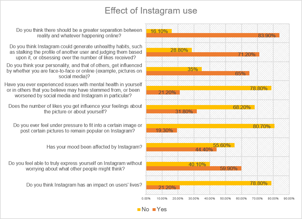 In this study, 65% respondents accepted that difference between being face to face or the pictures uploaded on social media could affect the personality of user, while 35% of participants gave their opinion against it. Interestingly, 78.8% participants never experienced mental health related issues that began or been worsened by social media and Instagram in particular. However, a significant proportion (21.2%) of study population agreed that the influence of Instagram (in particular), is responsible for worsening of issues related to mental health. Furthermore, 31.8% participant admitted that their feelings about themselves get influenced by the number of "likes" on Instagram, while 68.20% participants reported that there is no effect of social media "likes" on their perception about themselves or any picture.