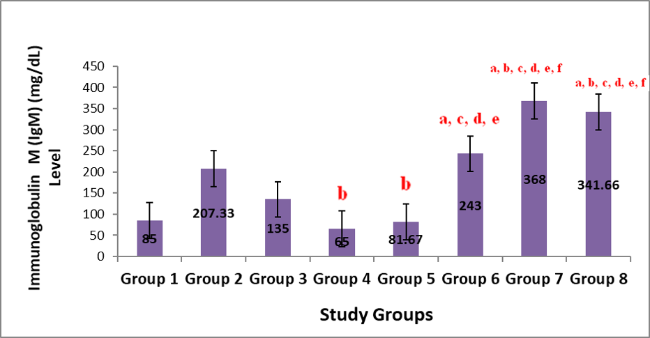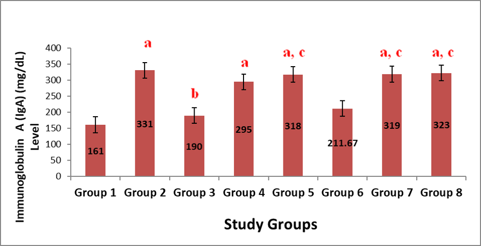 Figure 3 shows the result on the effect of administration of aqueous leaf extract of Justicia carnea (ALEJC) on IgA levels in male Wistar rats. On the changes in IgA levels, groups 2, 4, 5, 7 and 8 showed marked (p<0.05) elevations when compared to group 1. And only groups 5, 7 and 8 indicated significant increases in the IgA levels compared to that of group 3.
