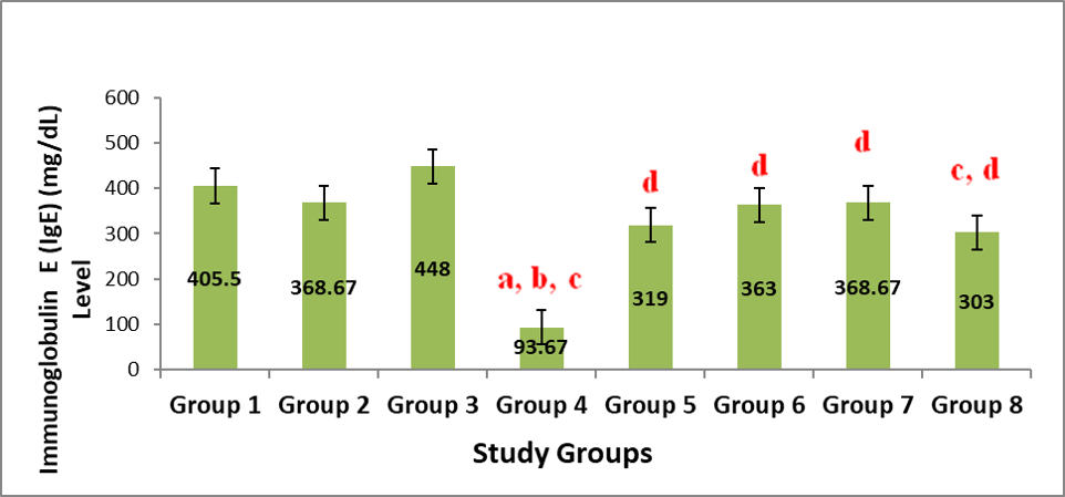 Figure 4 shows the result on the effect of administration of aqueous leaf extract of Justicia carnea (ALEJC) on IgE levels in male Wistar rats. The IgE level varied non-significantly (P>0.05) in a non-uniform manner across the various doses except that of group 4 that was significantly (P<0.05) reduced when compared to all other groups. Similarly, group 8 was markedly reduced (P<0.05) when compared to that of 3.The IgE level varied non-significantly (P>0.05) in a non-uniform manner across the various doses except that of group 4 that was significantly (P<0.05) reduced when compared to all other groups. Similarly, group 8 was markedly reduced (P<0.05) when compared to that of 3.