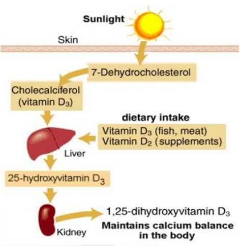 These and other actions in many cell types not involved in mineral metabolism are mediated by the vitamin D receptor. Its most important function is to enhance intestinal absorption of calcium. Other actions in the body are:- stimulation of intestinal phosphate absorption, suppression of parathyroid hormone (PTH) and regulation of osteoblast function. Vitamin D and its metabolites have a major role because of their interrelationship with calcium homeostasis and skeletal metabolism. Severe hypovitaminosis of vitamin D resulting in Rickets (children) and osteomalacia (children and adults) is now uncommon except in high risk populations with unusually low sun exposure, lack of vitamin D in fortified foods and malabsorptive syndromes. In addition to its vital role in calcium homeostasis, vitamin D by the vitamin D receptor (VDR) is involved in regulation of myocytes, cancer cells, and the immune, cardiovascular and metabolic system [2].