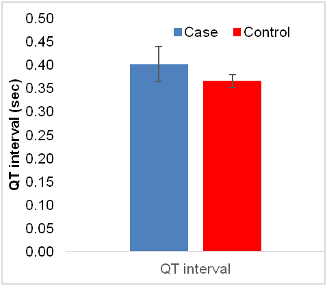 The mean values of ECG parameters were compared between the case and the control groups using independent sample t-test as shown in the Table 1. The results showed a significantly wider QRS (p = 0.011) and longer QT (p = 0.003) and QTc (p = 0.002) in pre-eclamptic pregnancy when compared with control group. There were no significant differences in the P wave duration and PR interval between the two groups. The mean QRS duration in pre-eclamptic women and normotensive pregnant women was found to be 0.10±0.02 and 0.09±0.005 seconds respectively. The mean QT interval was 0.401±0.03 sec in pre-eclamptic women and 0.365±0.014 sec in normotensive pregnant women as shown in Figure 1 and the mean QTc interval was found to be 457.73±37 msec in pre-eclamptic women and 416.47±25.4 msec in normotensive pregnant women as shown in Figure 2 and there was significant difference between the two groups (p=0.002). The pre-eclamptic women had lower heart rate (HR) and higher Sokolow index than normotensive pregnancy but the difference were not statistically significant.